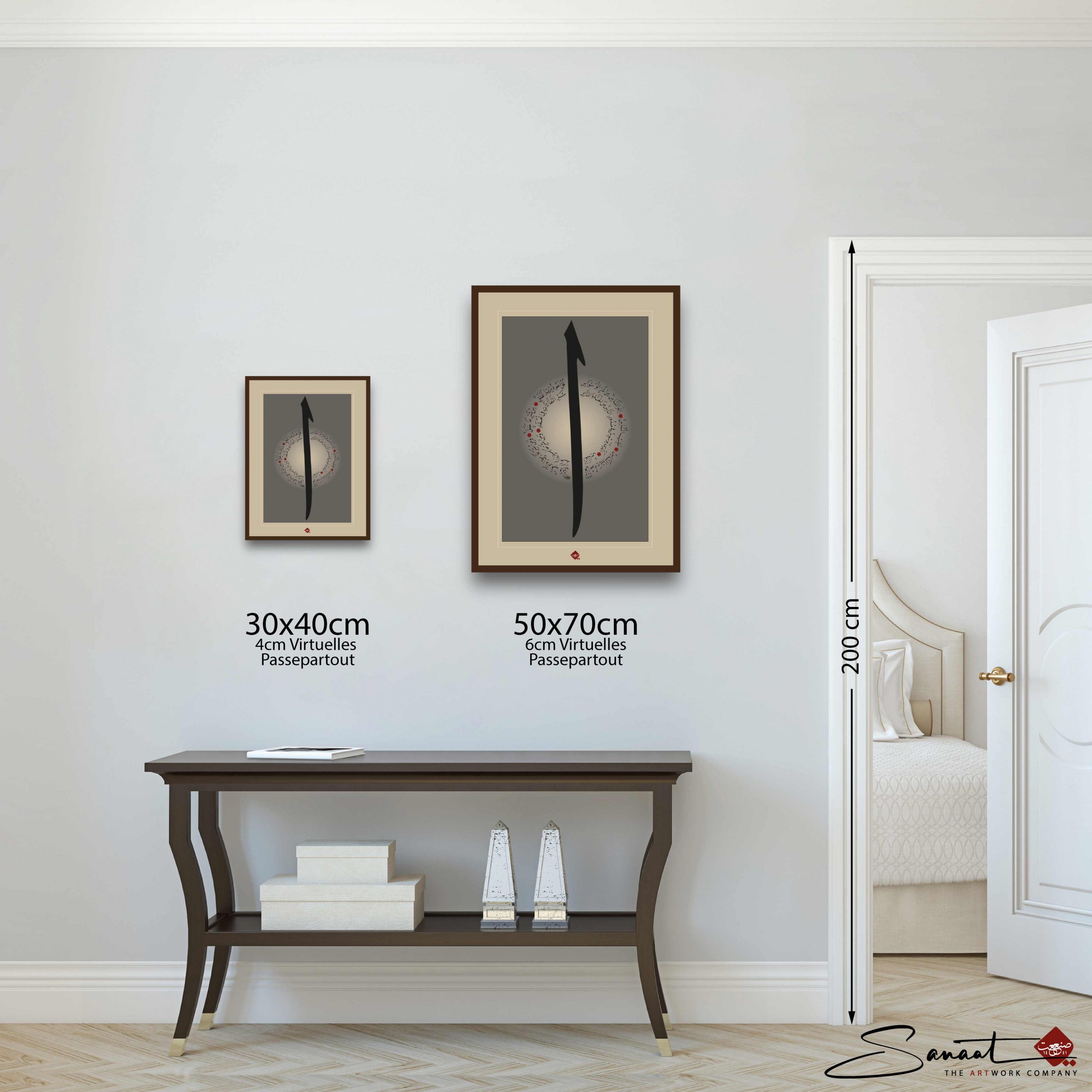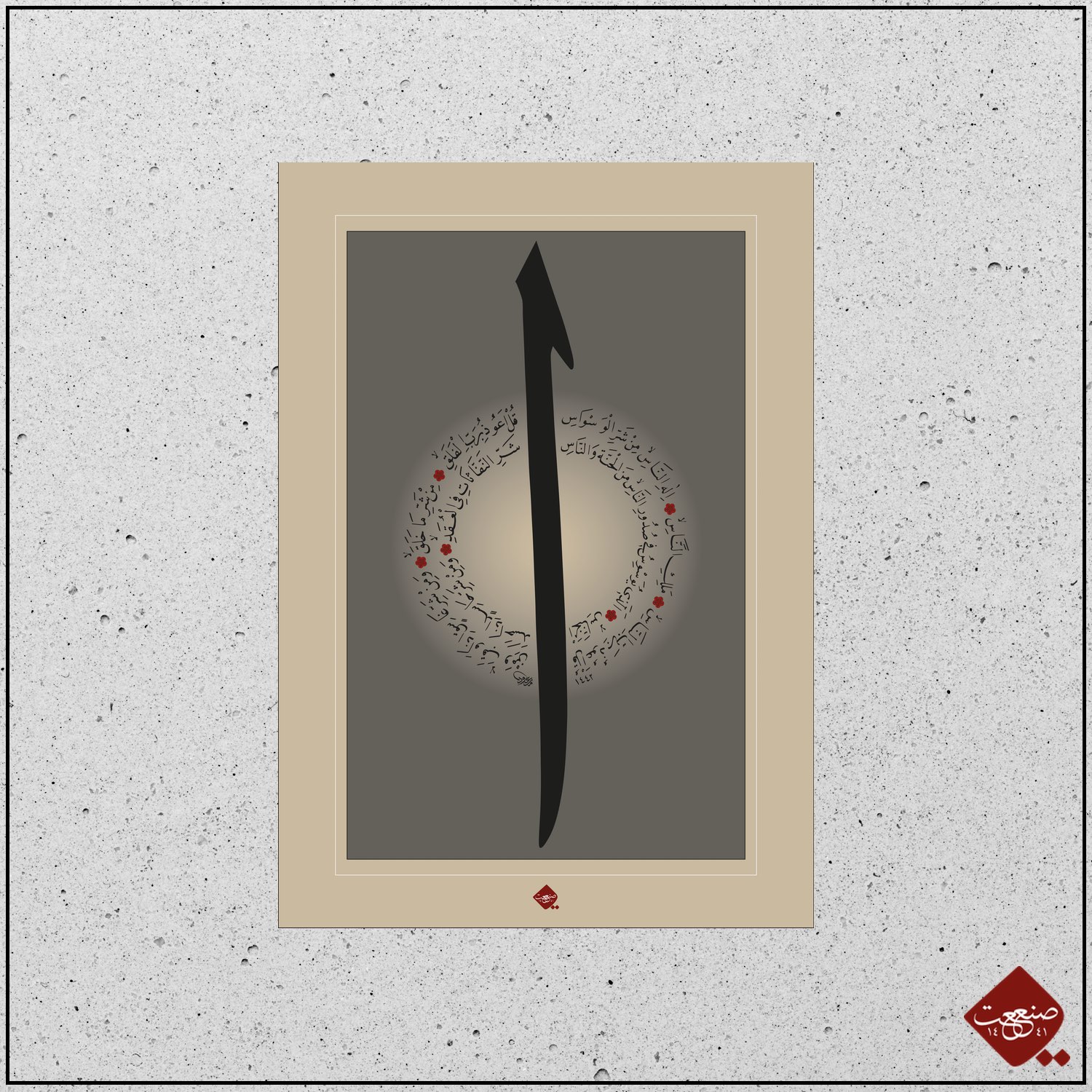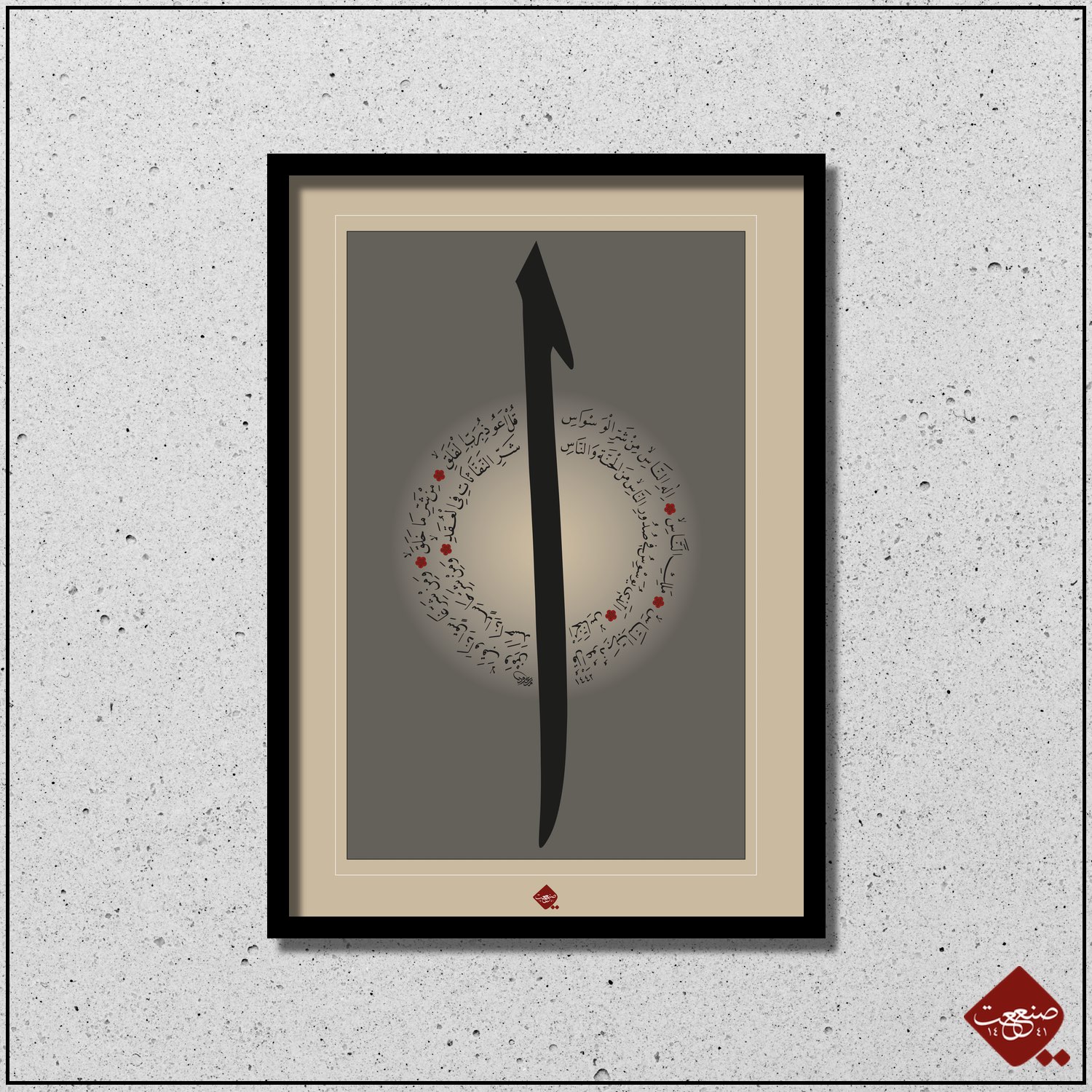 Künstlerische Darstellung des arabischen Buchstabens Elif. Außenherum stehen die zwei Suren al-Falaq (Sure 113) und an-Nas (Sure 114).