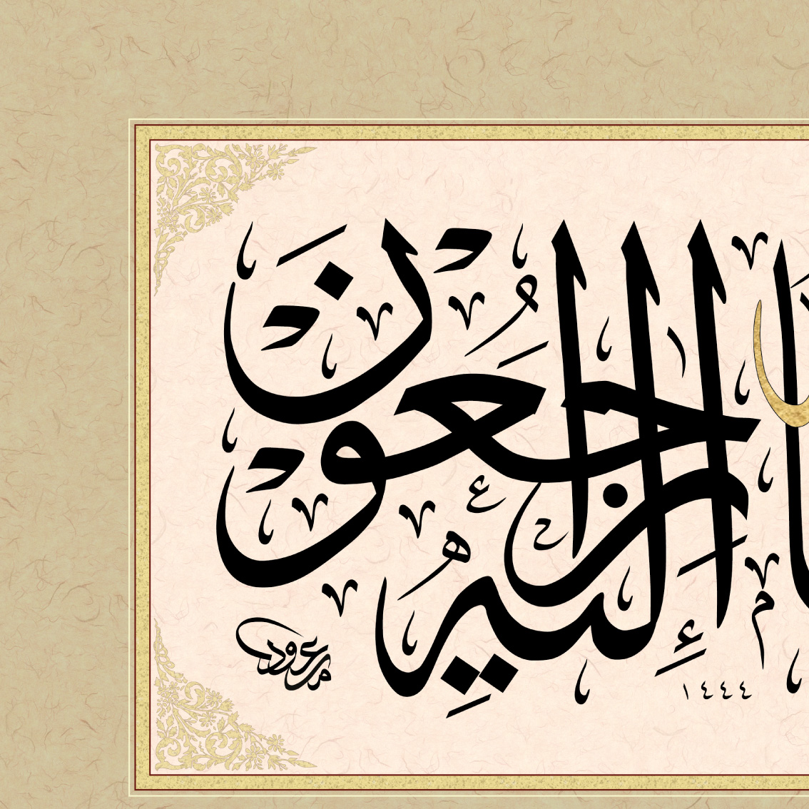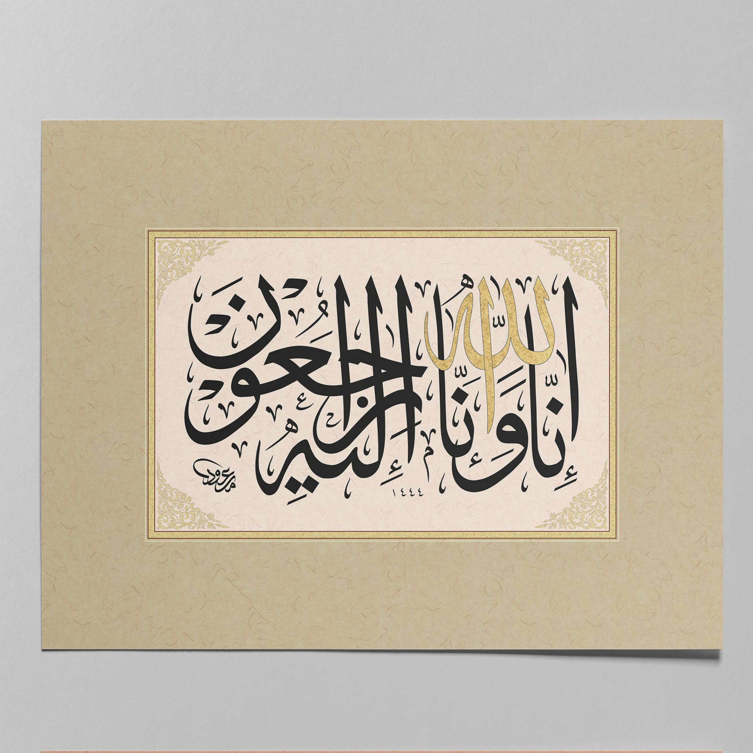 Dieses exquisite Kunstwerk stellt einen tiefgründigen Vers aus der arabischen Kalligraphie dar: „Wir gehören zu Allah und zu Ihm kehren wir zurück“. Dieser Vers ist ein zentrales Element im islamischen Glauben, insbesondere in Zeiten des Trauerns. Er wird von Muslimen oft verwendet, um sich gegenseitig Beileid zu wünschen und Trost zu finden. Das Design kombiniert traditionelle arabische Kalligraphie mit modernen ästhetischen Elementen, um ein visuell ansprechendes und spirituell bedeutsames Kunstwerk zu schaffen. Jeder Strich der Kalligraphie ist sorgfältig gefertigt, um die Schönheit und Tiefe des Verses widerzuspiegeln.