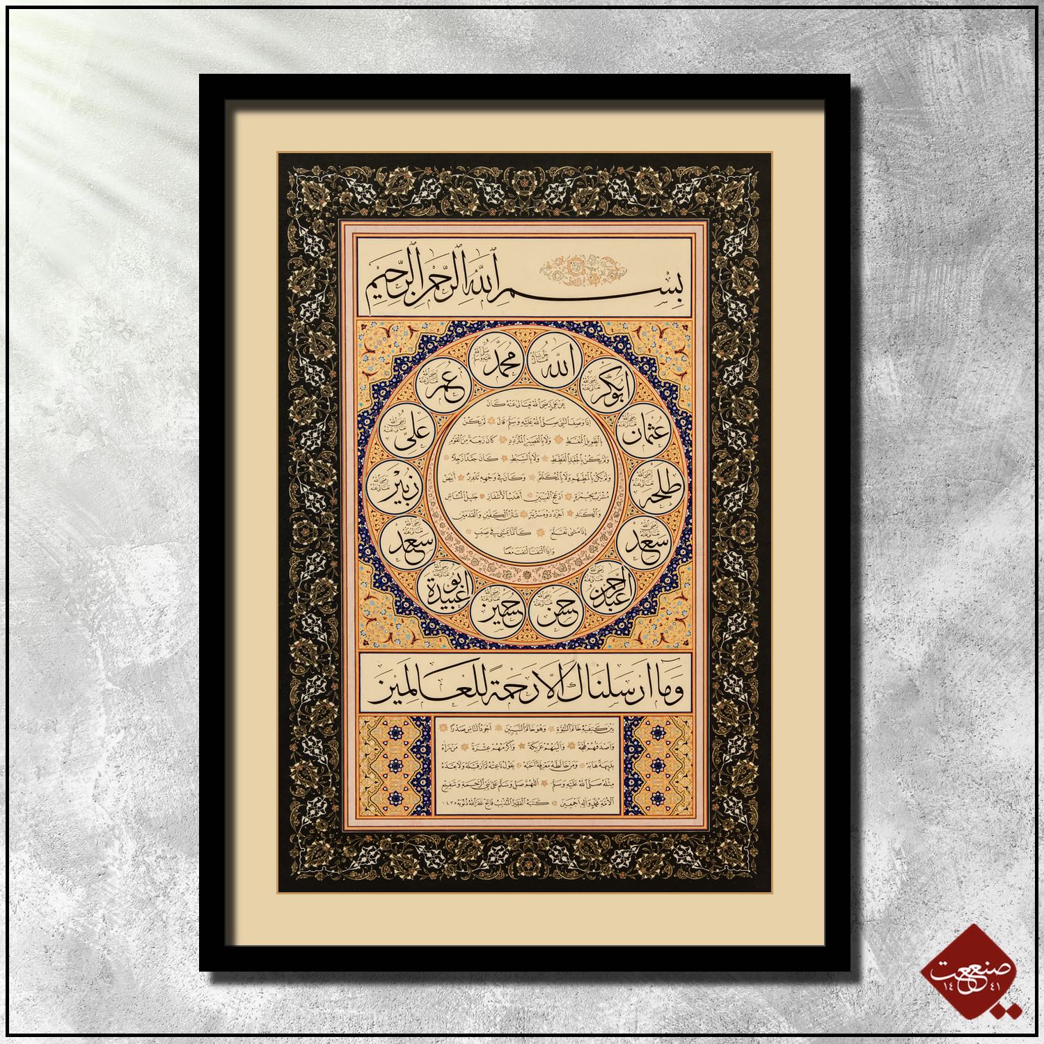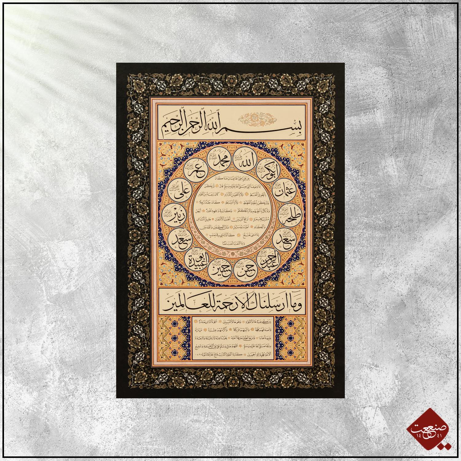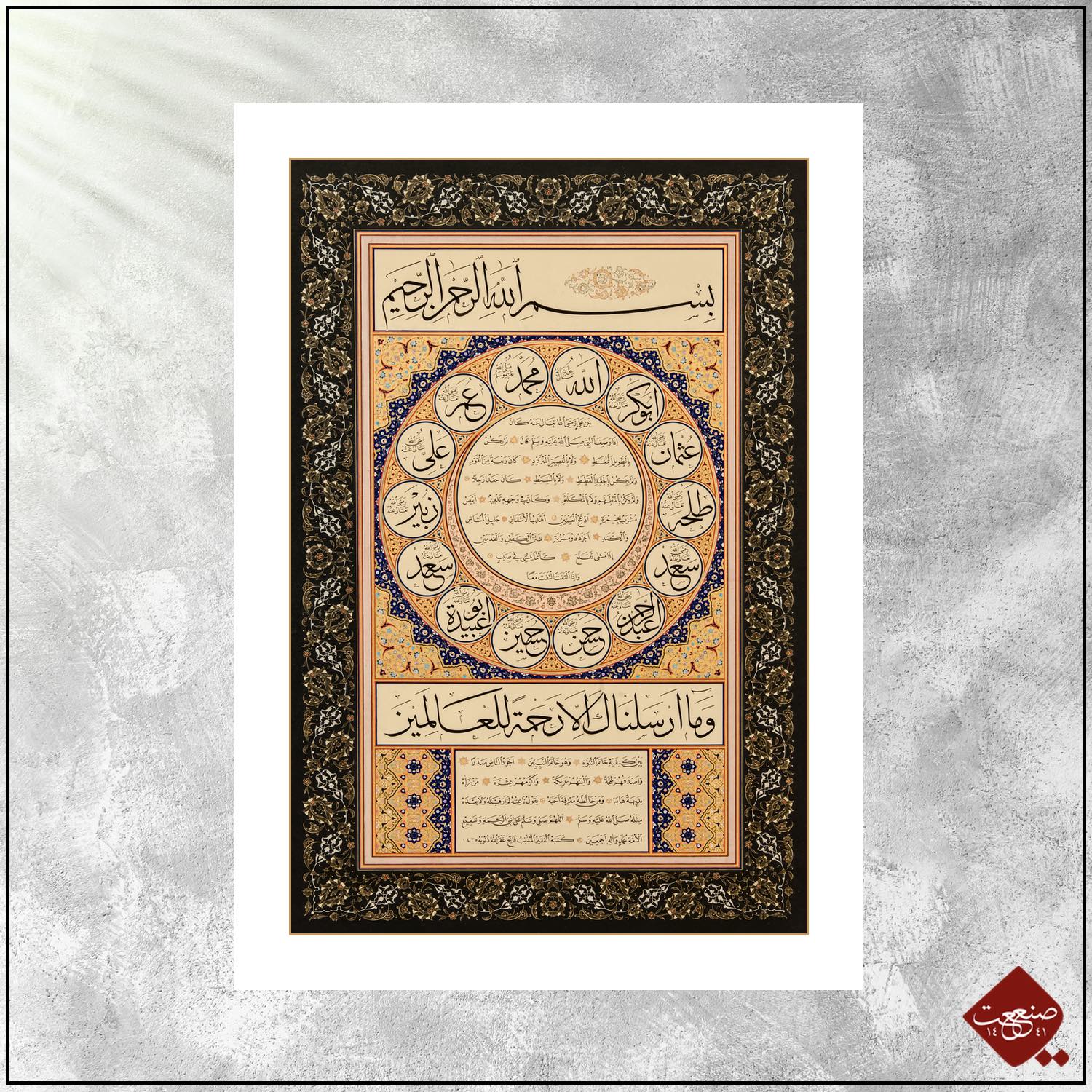 Die ʿAschara Mubaschschara (al-ʿAšara al-mubaššara) sind eine Gruppe von zehn Gefährten des Propheten Mohammed (s), denen dieser nach sunnitischer Lehre das Paradies verheißen hat. Diese 10 Weggefährten umranden dieses Kunstwerk: