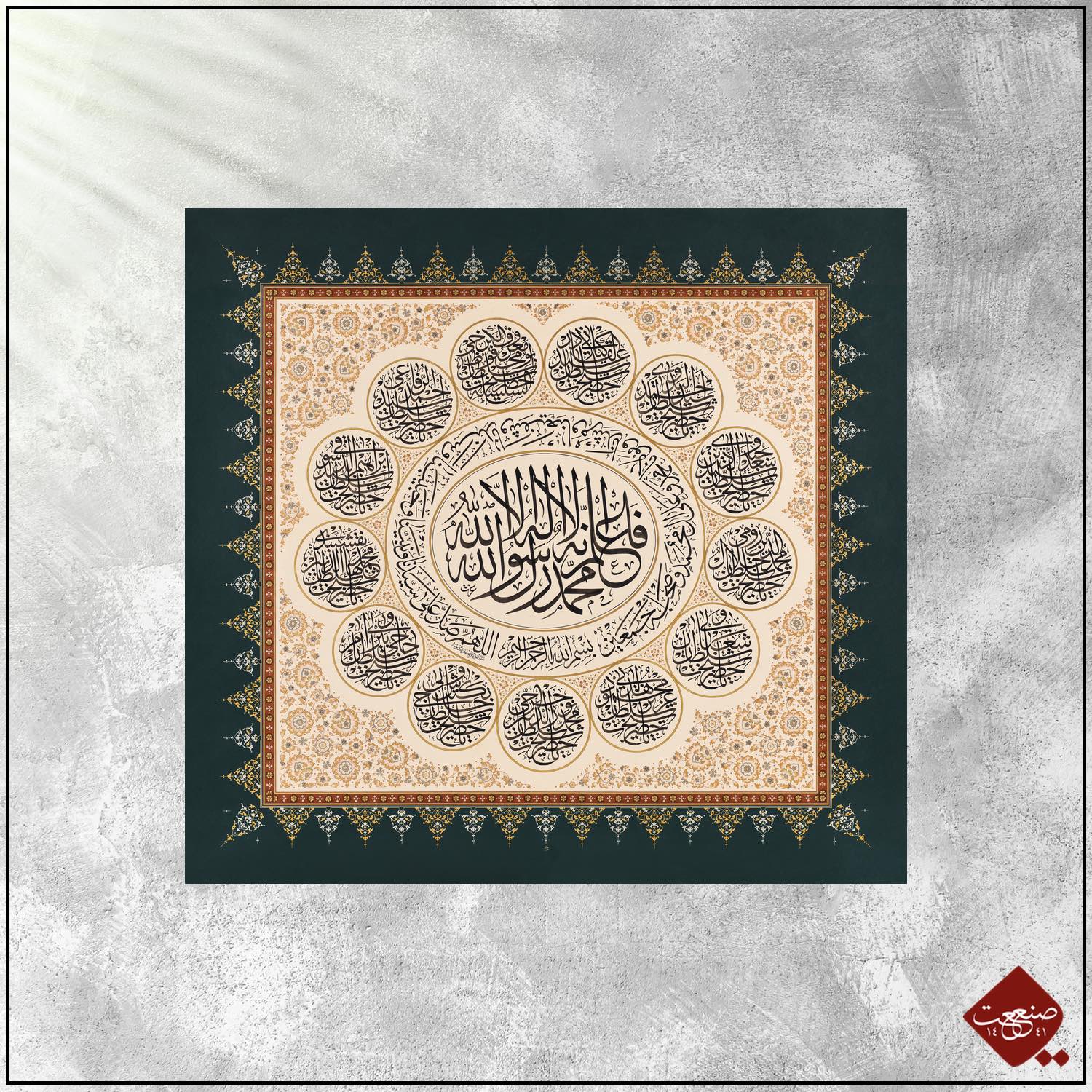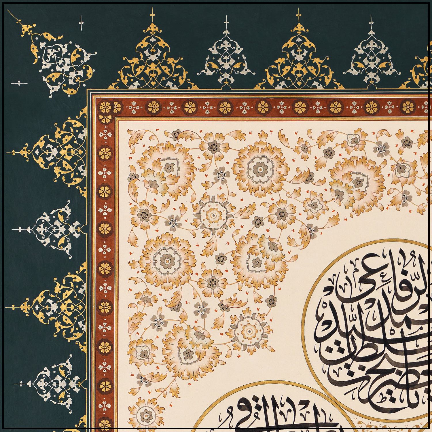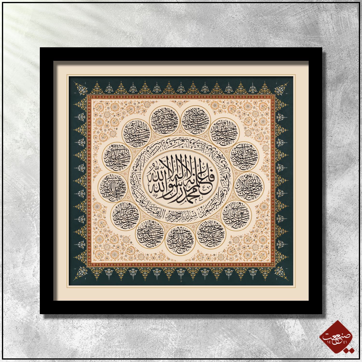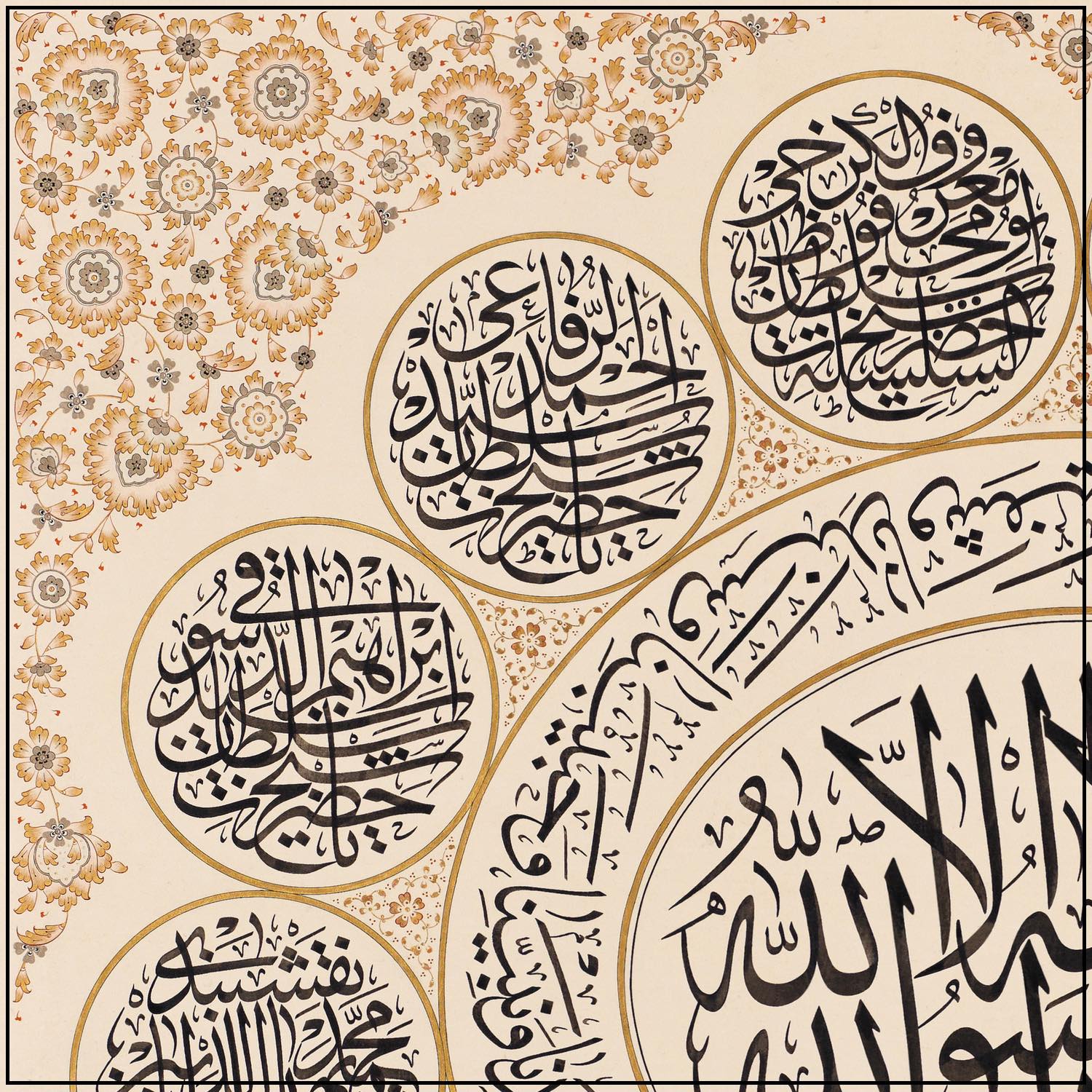 Im inneren Kreis: „Fa’lem ennehû lâ ilâhe illallah, Muhammedun Rasûlullah“ – „So vergiss diese Tatsache nie, es gibt keine Gottheit außer Allah und Muhammad (s) ist sein Gesandter“