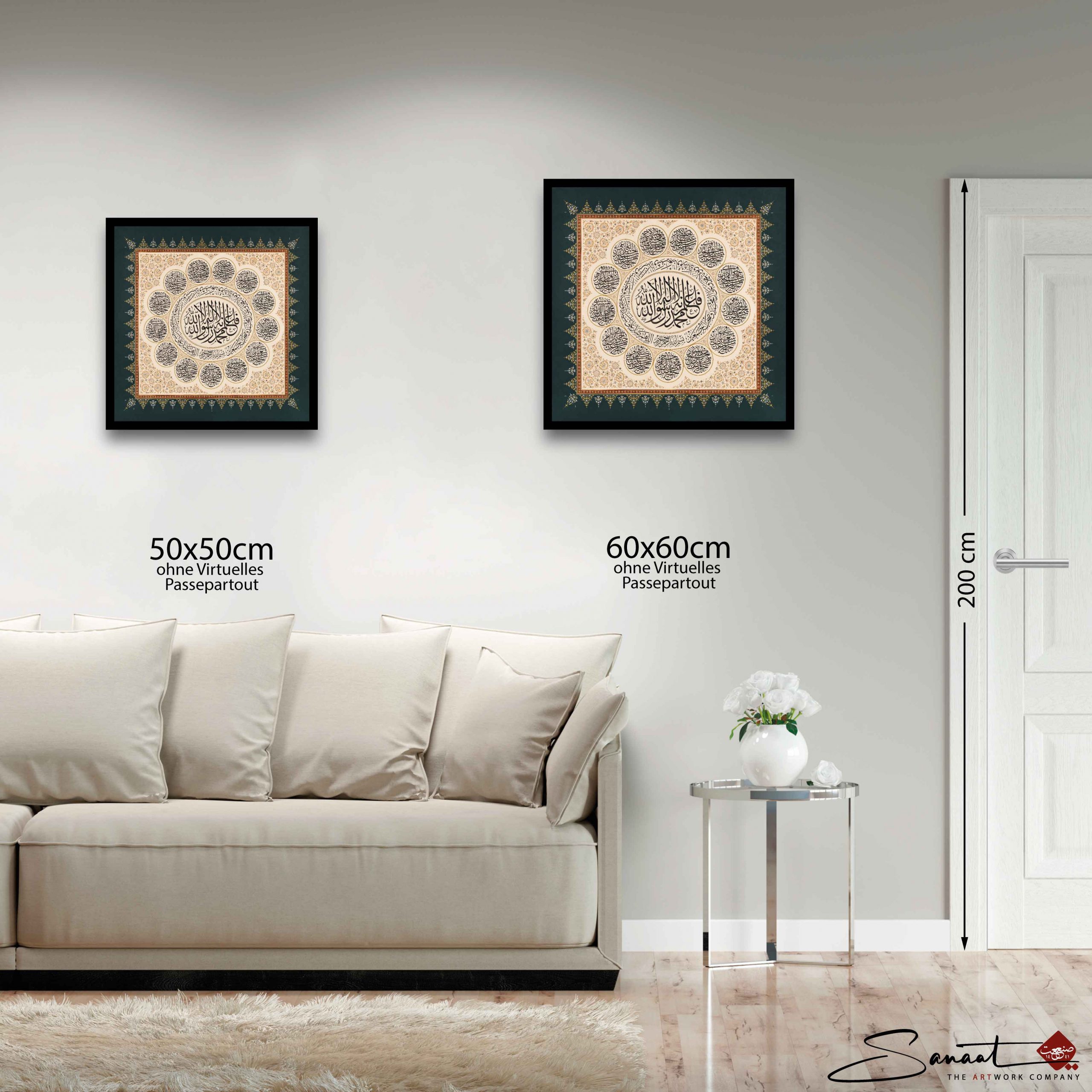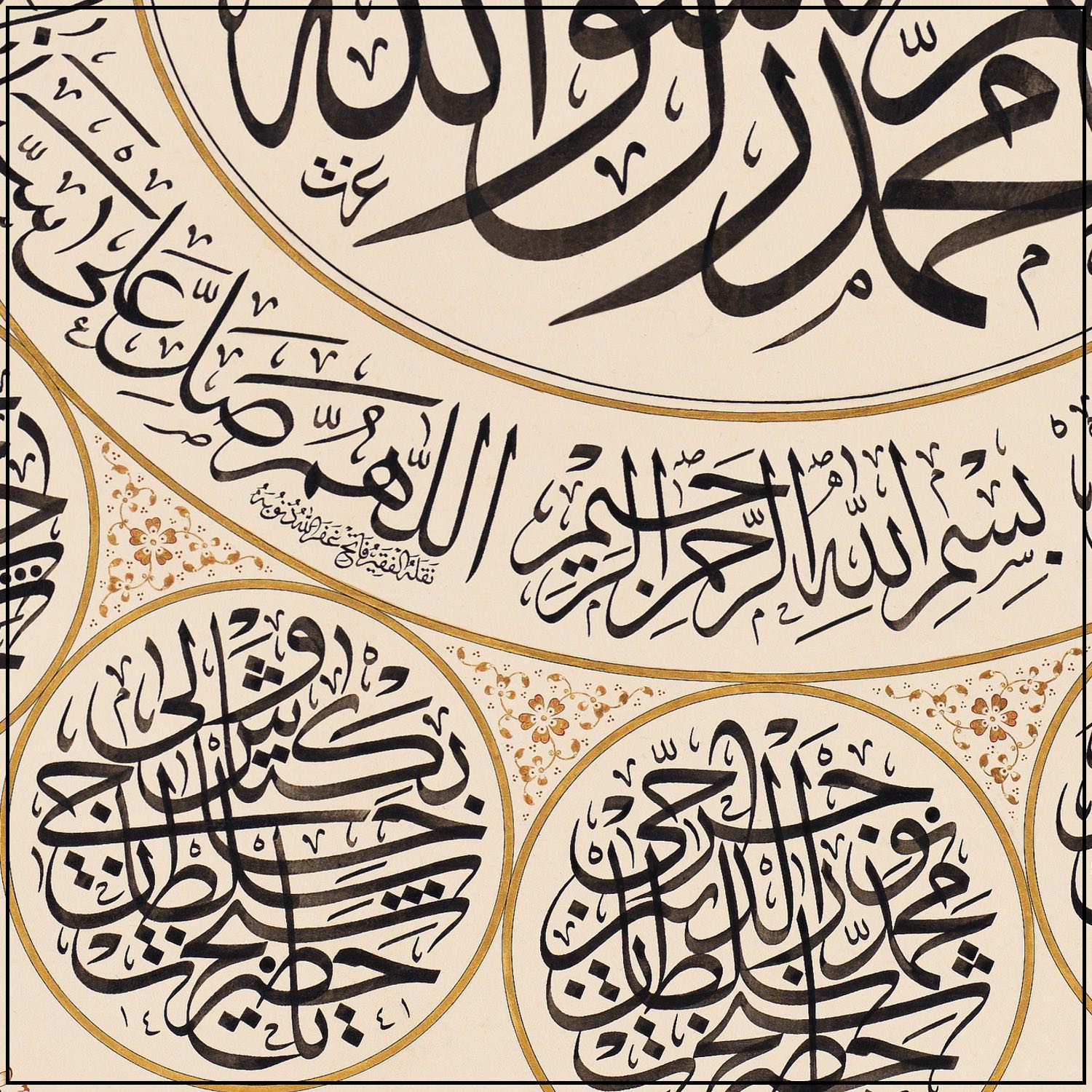 Im zweiten Kreis: „Allahümme salli alâ Seyyidinâ ve Nebiyyinâ ve Habibinâ ve Senedinâ ve Sefiinâ ve Mürsidinâ ve Mevlâna Muhammedin ve alâ Âl-i Muhammedin ve Sahbihì ecmaîn“