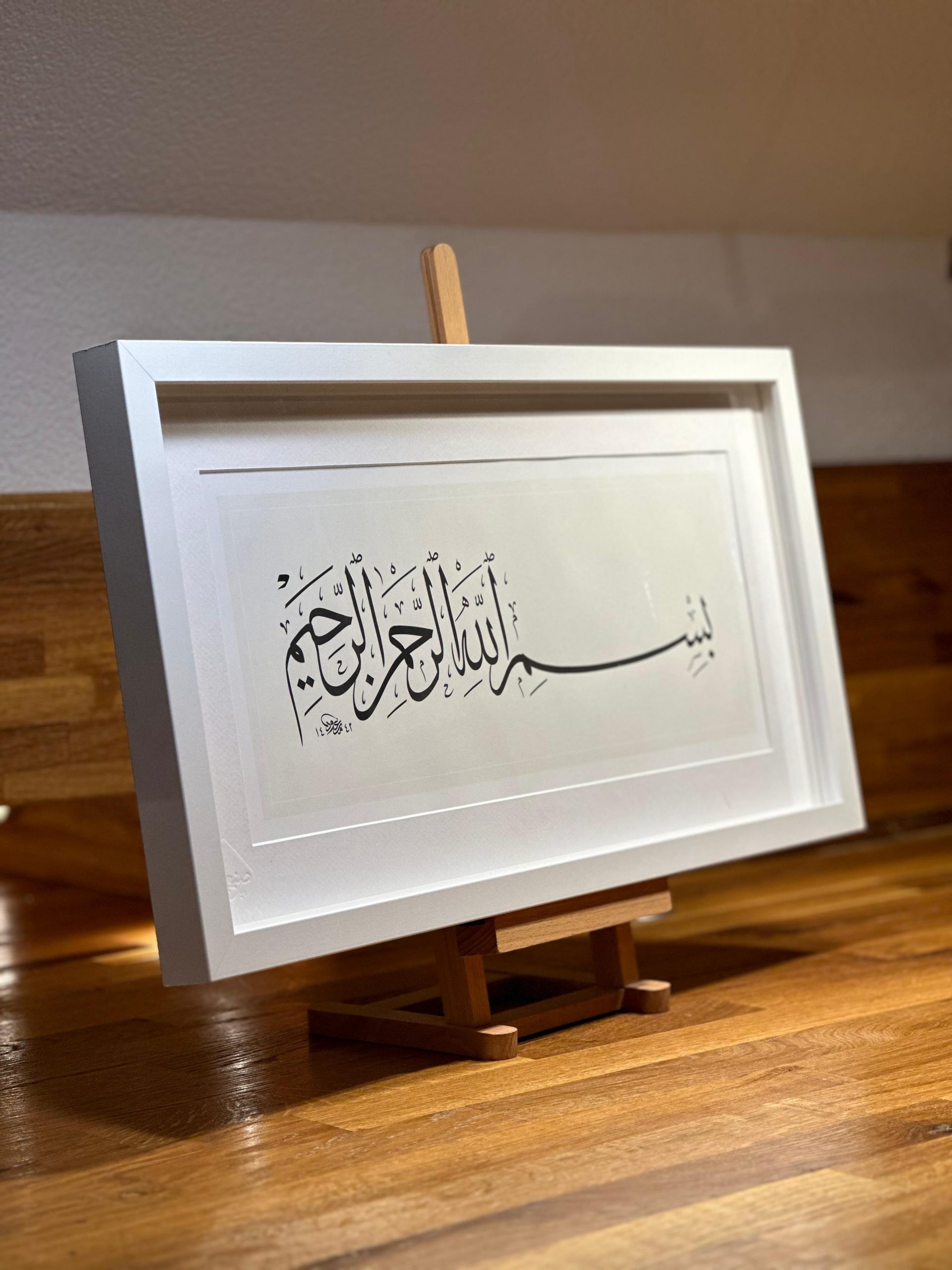 Die Basmala, hier im Thuluth Schriftstil, ist eine arabische Anrufungsformel, die mit Ausnahme der Sure 9 am Anfang jeder Sure des Korans steht und eine wichtige Rolle im Gottesdienst und Alltag der Muslime spielt.