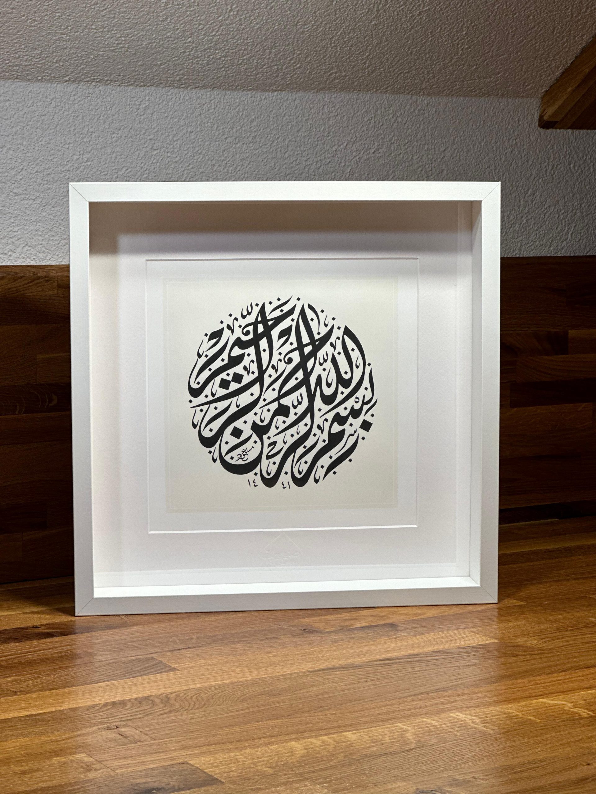Die Basmala, hier im Diwani Schriftstil, ist eine arabische Anrufungsformel, die mit Ausnahme der Sure 9 am Anfang jeder Sure des Korans steht und eine wichtige Rolle im Gottesdienst und Alltag der Muslime spielt.