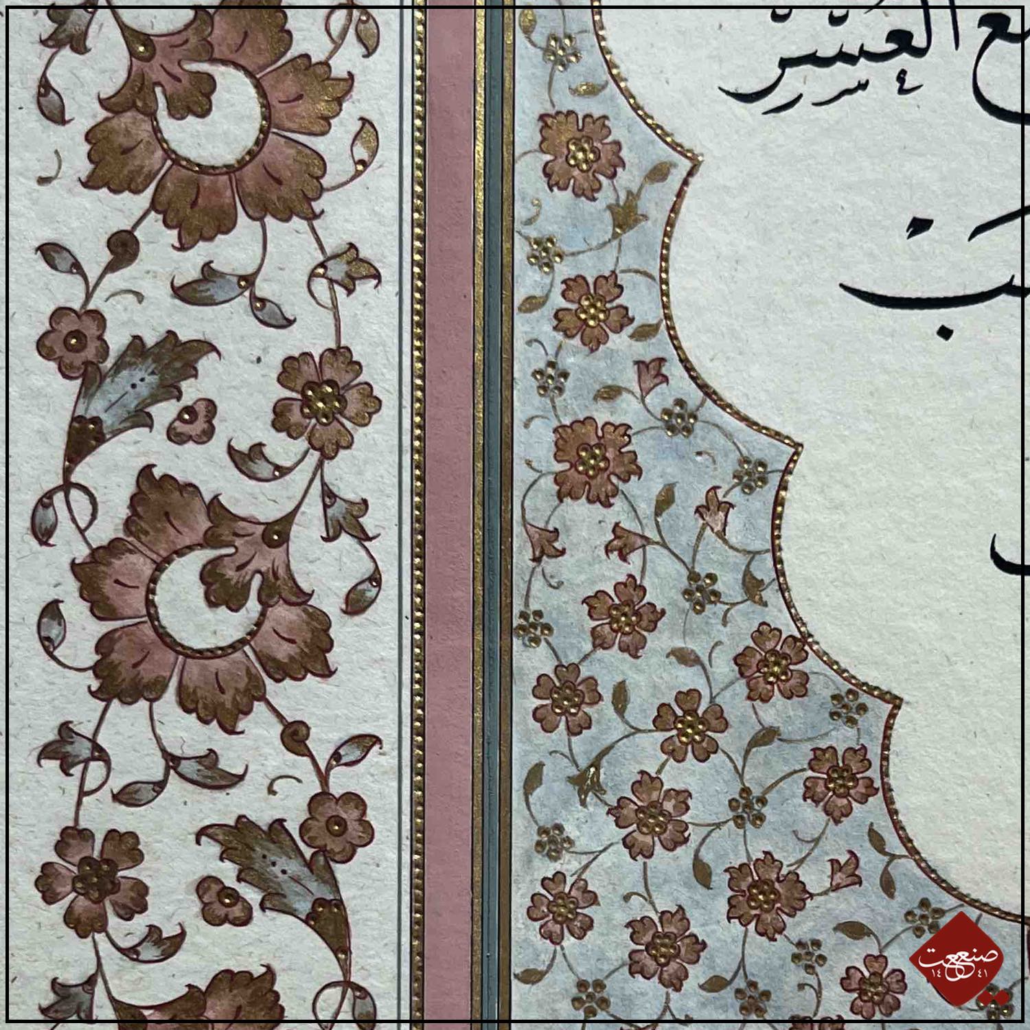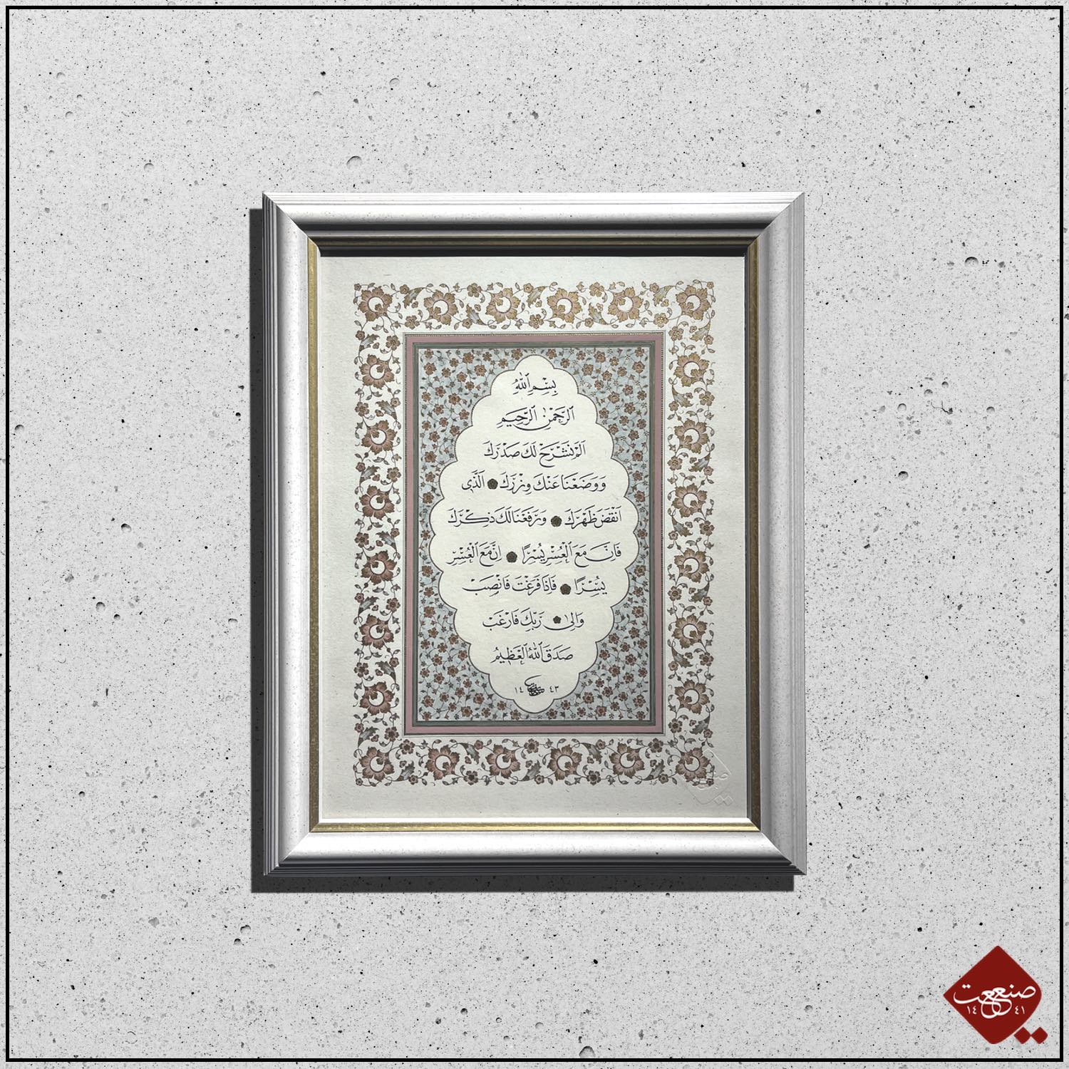 Auf diesem originalen Kunstwerk ist in der Mitte in ovaler Form die 94. Sure “al-Inshirah” zu sehen.