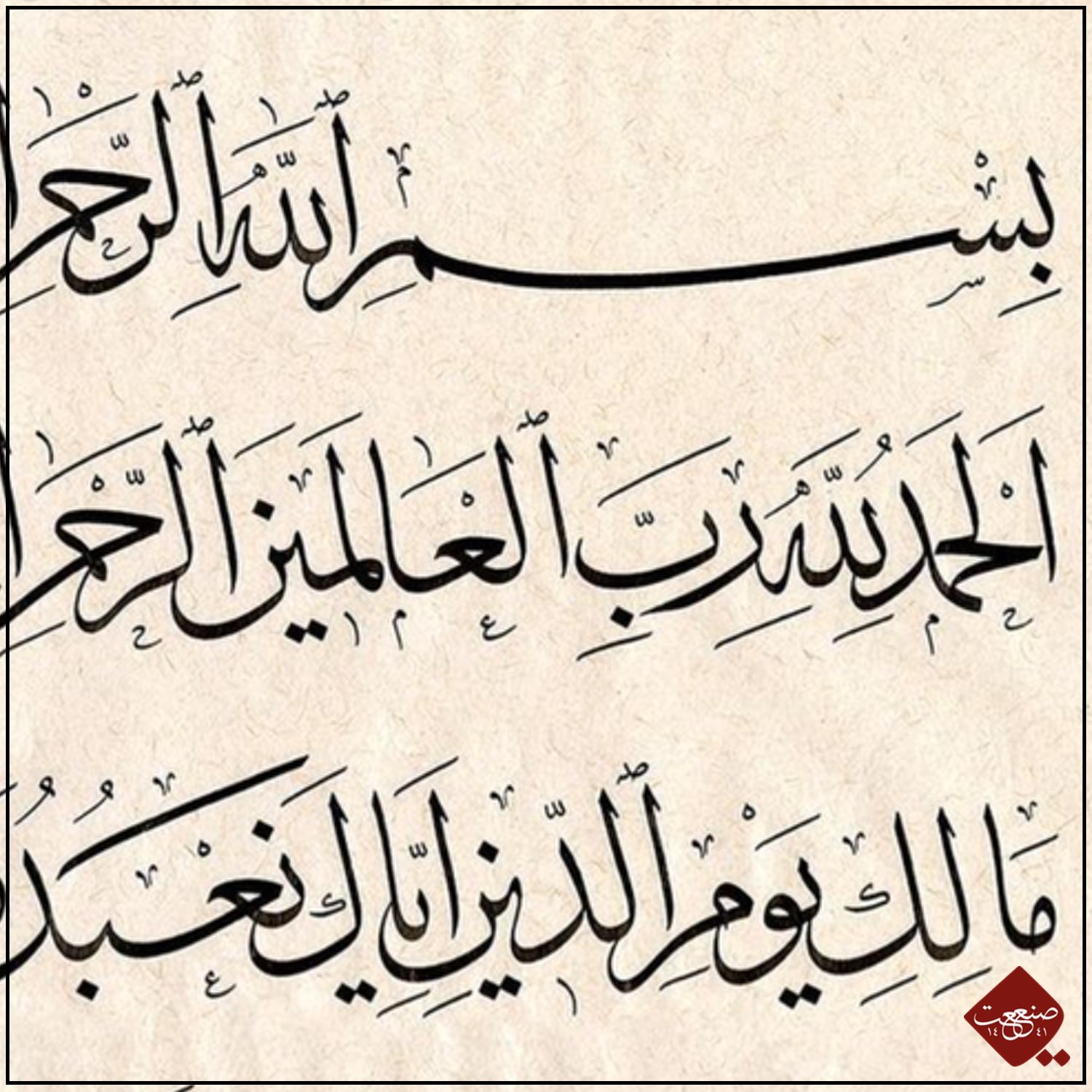 Auf diesem originalen Kunstwerk steht zentriert in mehreren Zeilen die gesamte Sure „al-Fatiha“